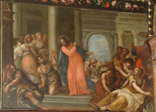Gesù scaccia i mercanti dal tempio (1690-1710), Carlo Scapin – olio su tela, cm 107×180 ca.