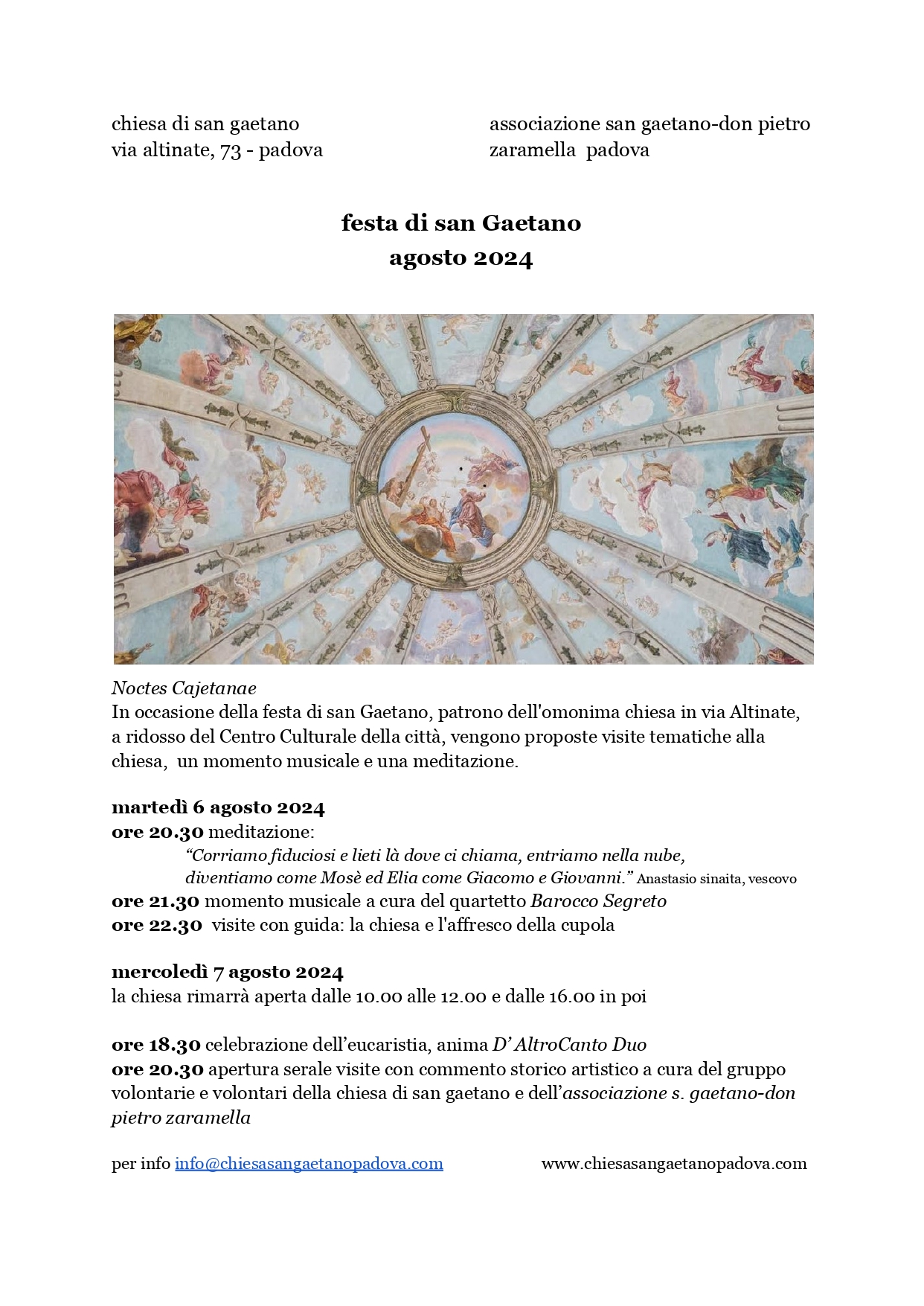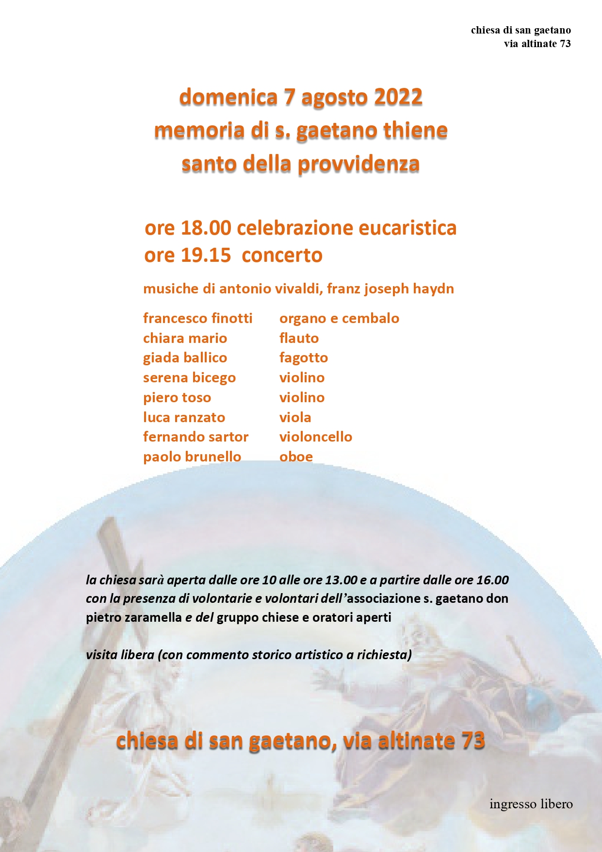 Domenica 7 agosto si terrà la celebrazione eucaristica e concerto in memoria di San Gaetano Thiene, Santo della Provvidenza.